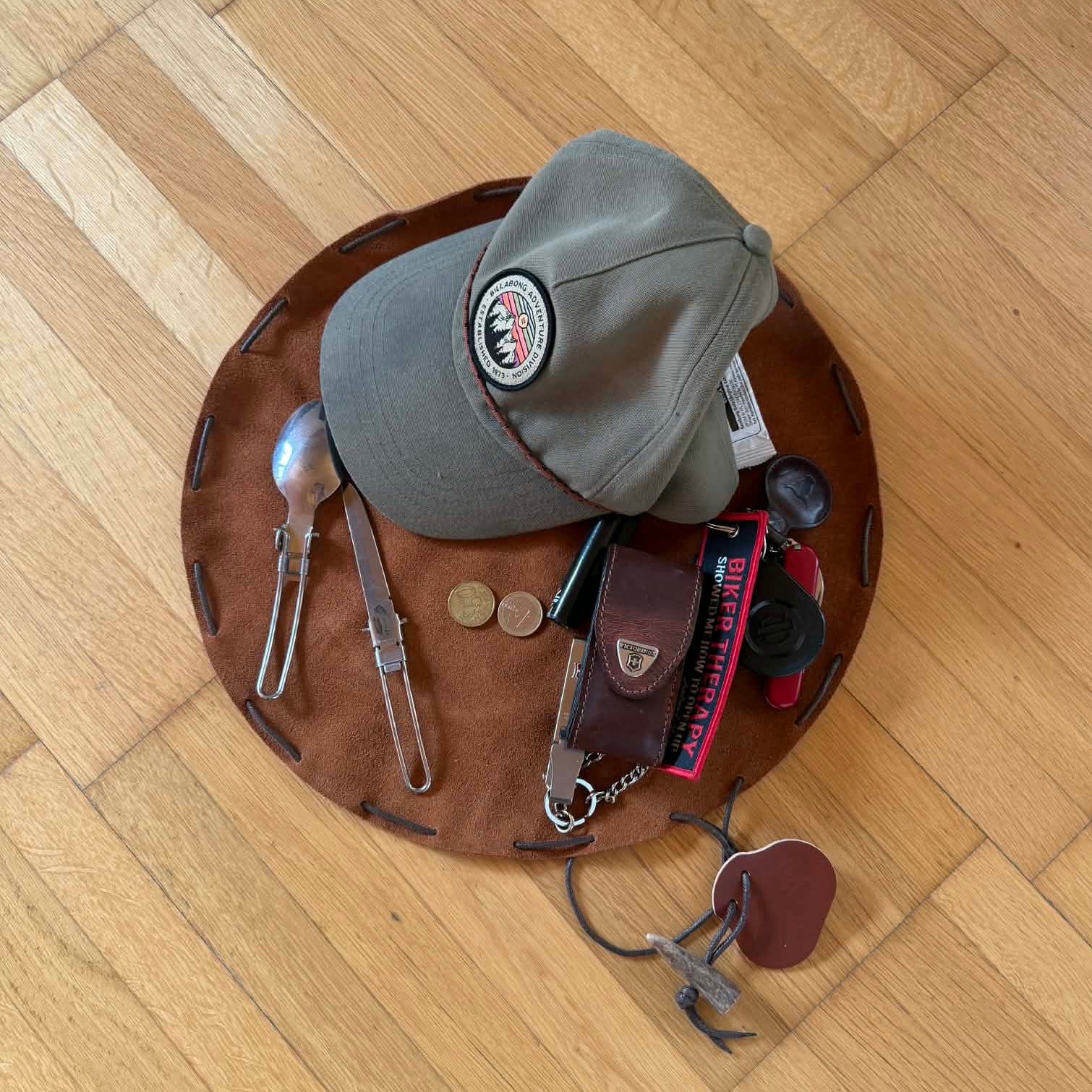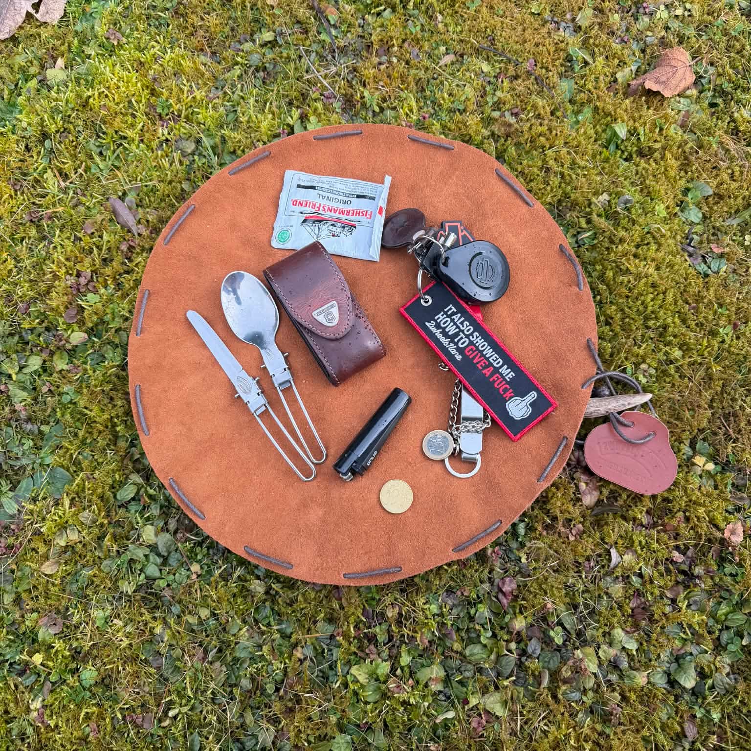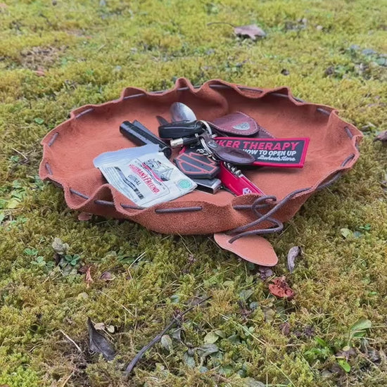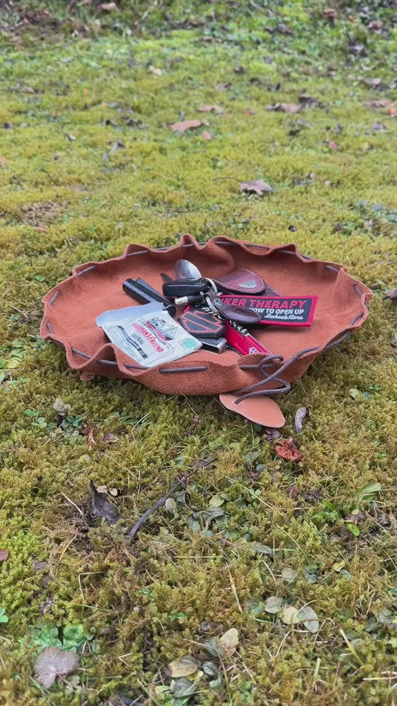 Crafted from durable 1.5mm cow suede leather, this lightweight drawstring pouch stores tools, camp kitchen gear, and survival essentials while riding. Unfold it at camp and it transforms into a 36cm (14.2 in) leather ground mat for organizing equipment, food, or small items.