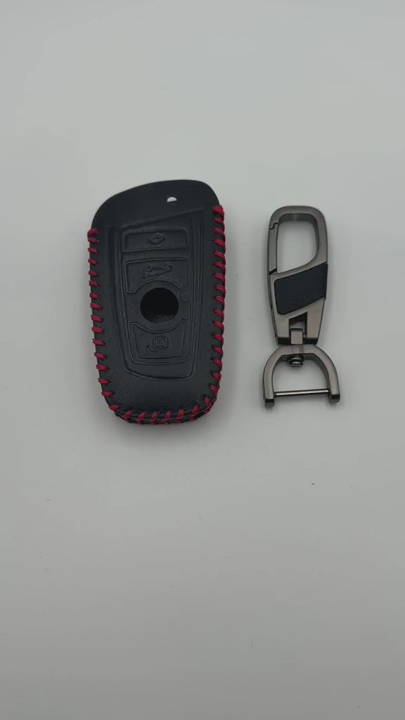 Premium Leather Key Cover for BMW Remote – Black with Red Stitching | Protective Car Key Case